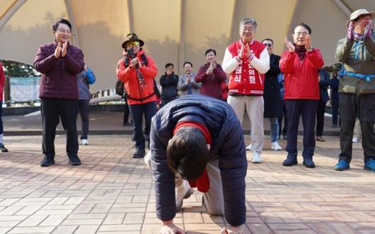 원 전 장관과의 개인적 친분으로 참석했다는 엄 대장은 "청룡의 해 계양산에 새로운 변화, 혁신의 바람을 몰고 올 후보"라고 추켜세웠다. 이어 "원희룡 후보 적극 성원, 응원해 주시고 함께 이 기운을 모아 올해 꼭 4월에 좋은 결과를 얻을 수 있게끔 도움을 주시길 바란다"고 했다. 이천수 회장은 "어머님 아버님, 저희 원희룡 후보님 많이 도와주십시오"라며 넙죽 큰 절을 올렸다. 환호성과 박수가 터져나왔다.