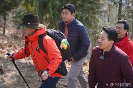 오전 10시쯤 산행이 시작됐다. "안녕하세요 원희룡입니다. 인사 좀 드리겠습니다." 이들 3인방은 마주치는 등산객들을 한 명도 놓치지 않으려는 듯 인사를 건네고 사진촬영 요청에 일일이 응했다. 등산로인 만큼 50대 이상 유권자들이 다수였는데, 이들은 "많이 좀 부탁드린다. 너무 낙후됐다", "이번엔 꼭 역전해야 한다. 썩은 돌덩이를 치워버려야 한다", "이천수, 우리 고향 사람 고생 많네 열심히 좀 해봐"라며 기대를 나타냈다.