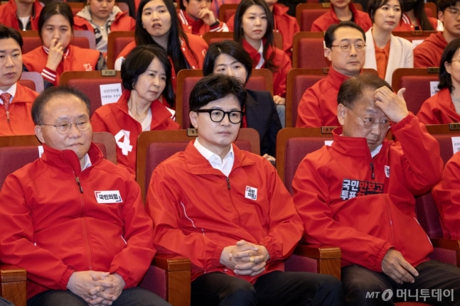 한동훈 국민의힘 비상대책위원장을 포함한 지도부는 굳은 표정으로 TV 화면만을 응시했다. 한 위원장은 양손을 깍지 낀 채 미동도 하지 않았다. 윤 원내대표 또한 표정이 점차 어두워져 가며 연신 숨을 크게 들이쉬었다. 김경율 국민의힘 비상대책위원은 머리를 긁적였다.